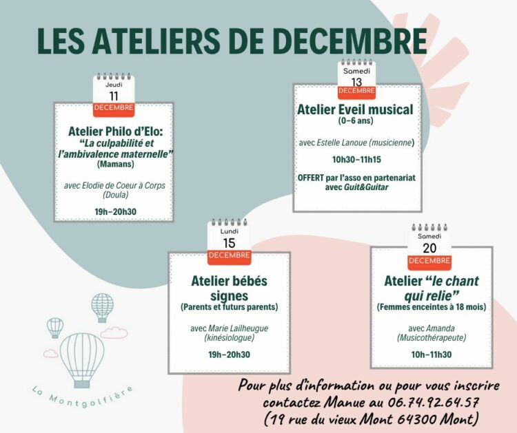 L’association La Montgolfière propose les ateliers suivants pour le mois de décembre :
