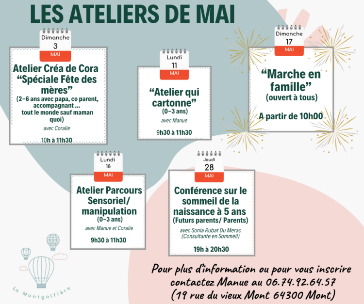 L’association La Montgolfière propose les ateliers suivants pour le mois de mai :