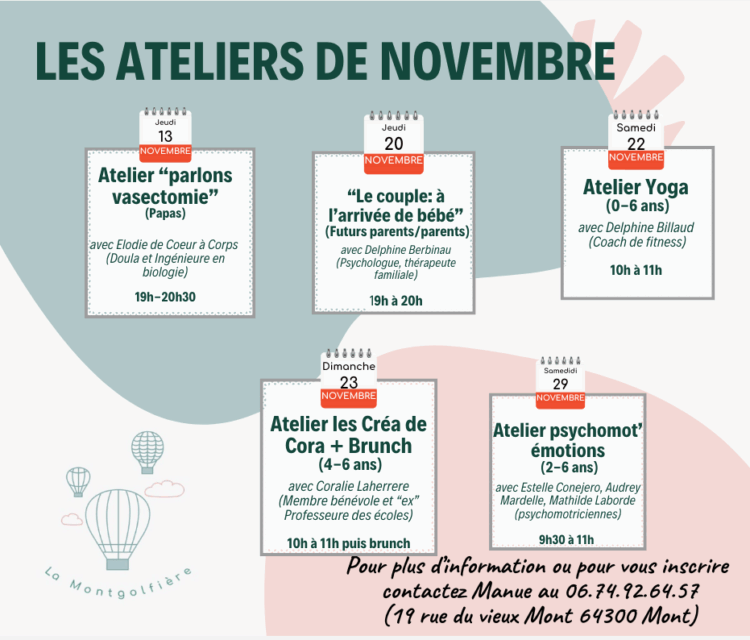 L’association La Montgolfière propose les ateliers suivants pour le mois de novembre :