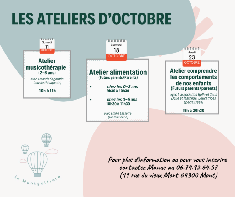 L’association La Montgolfière propose les ateliers suivants pour le mois d’octobre :